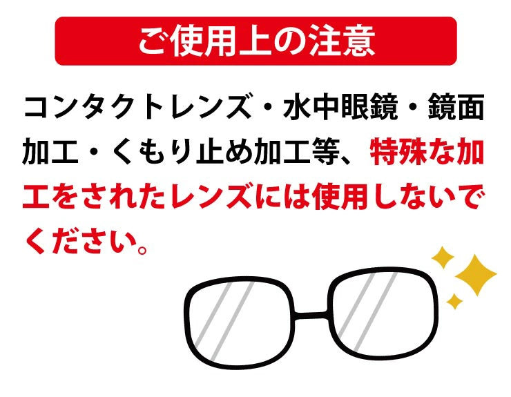 ※コンタクトレンズや水中メガネには使用できません。 ※ 極細繊維の布は使用しないでください。 ※ 超撥水コートレンズ等は液体自体をはじくので、十分なくもり止め効果が得られない場合があります。 |