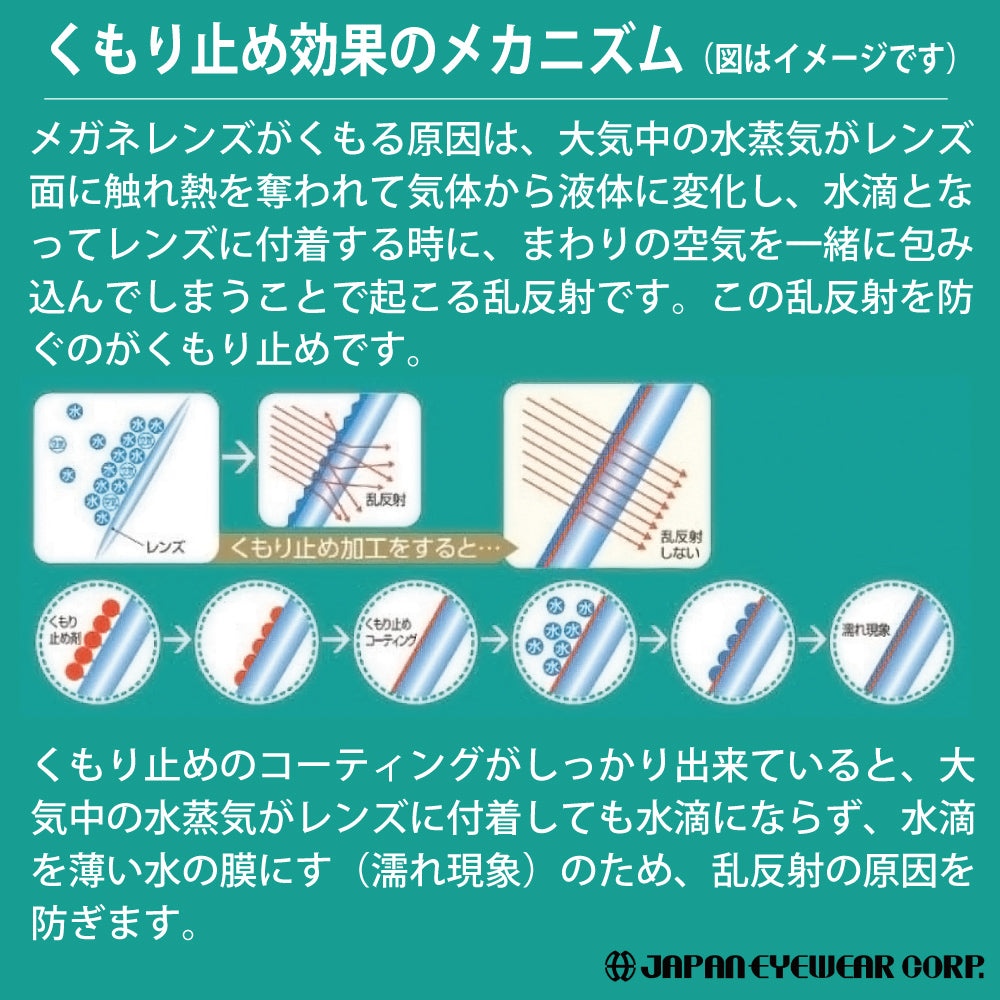 | 注意事項 | ※メガネ拭きで拭きあげると曇り止め効果のある成分まで拭き取ってしまい効果が薄れてしまします、ティッシュで拭きあげる際もあまり拭きすぎると効果が薄れてしまいますので曇りが気にならない程度に拭いてください。 |